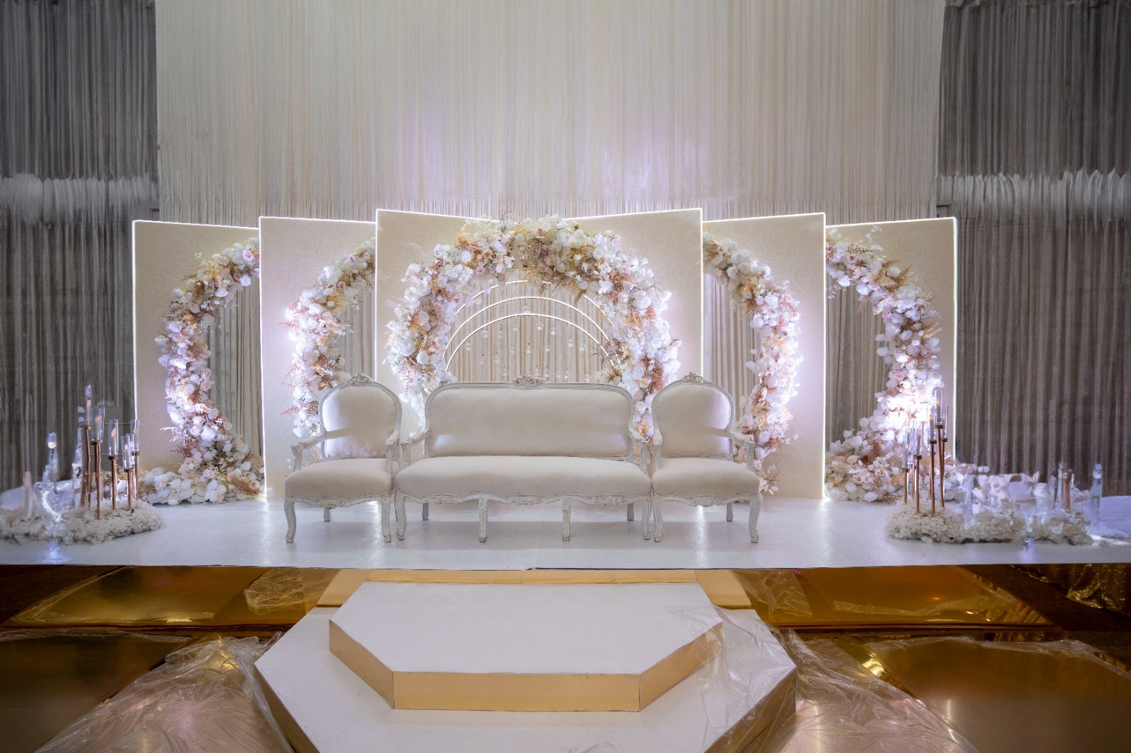 From breathtaking sweetheart tables and statement stage backdrops to dramatic dance floors and floral ceiling installations, every element is curated to enhance beauty and amplify celebration.